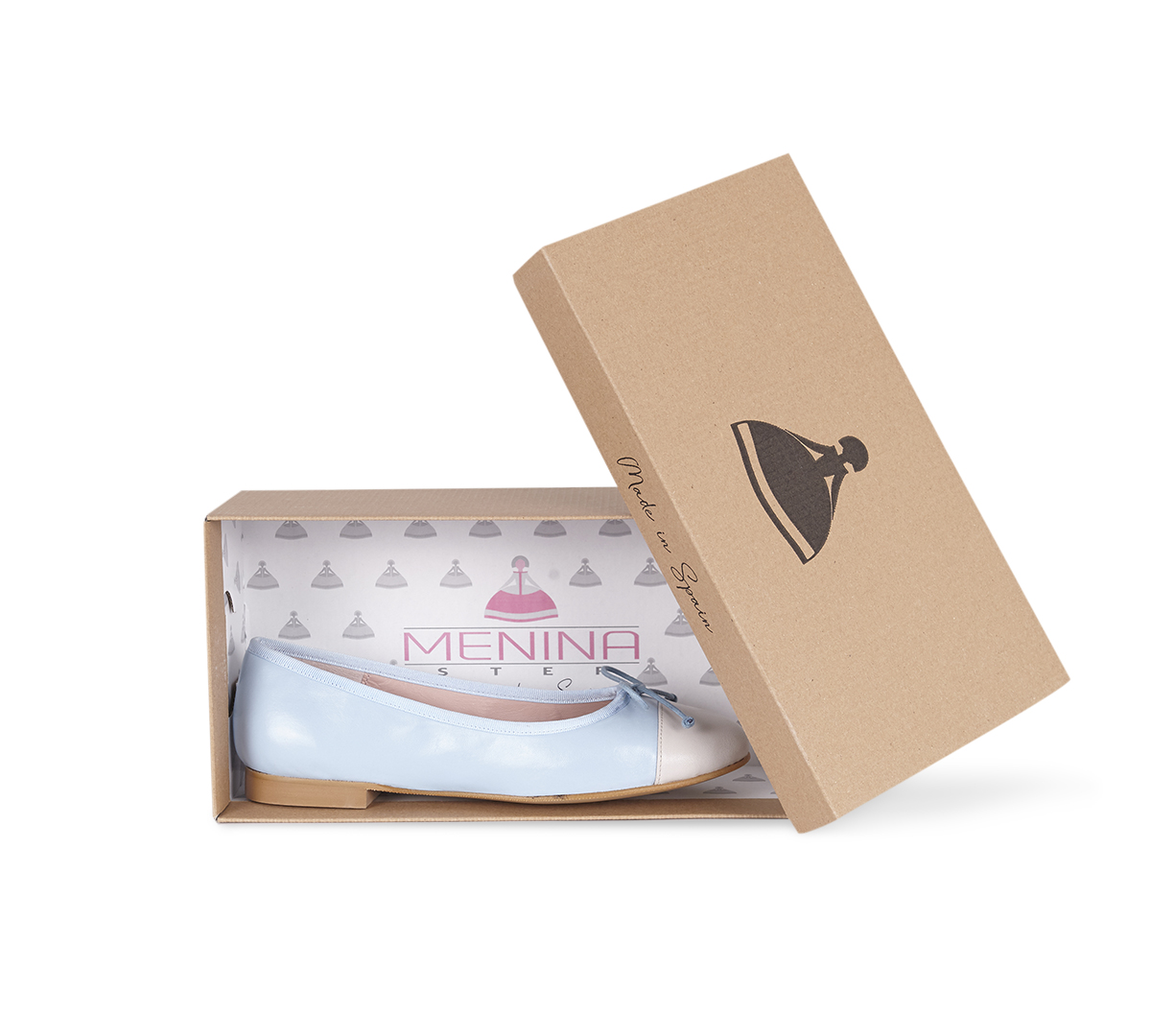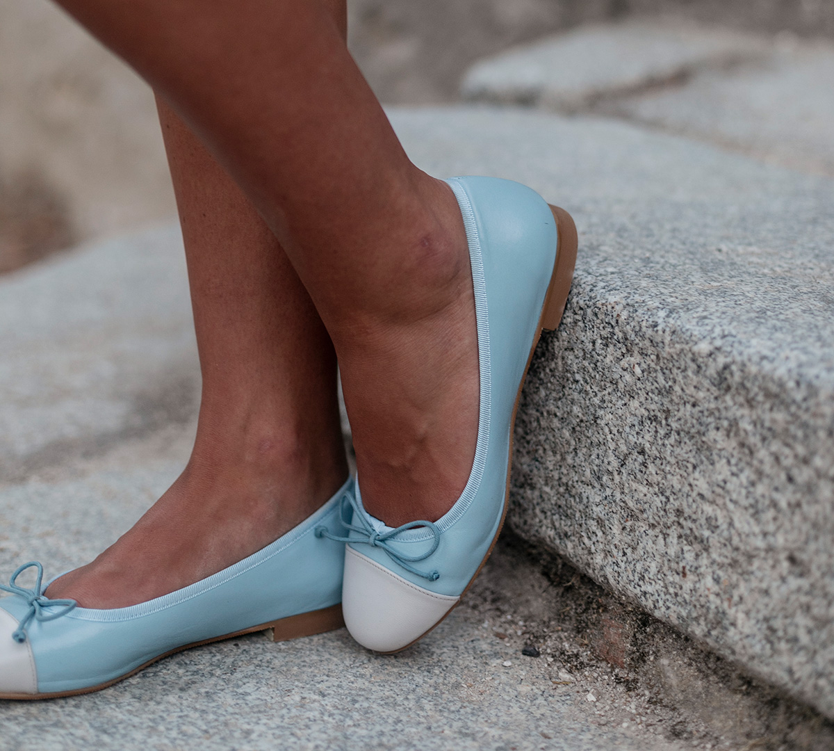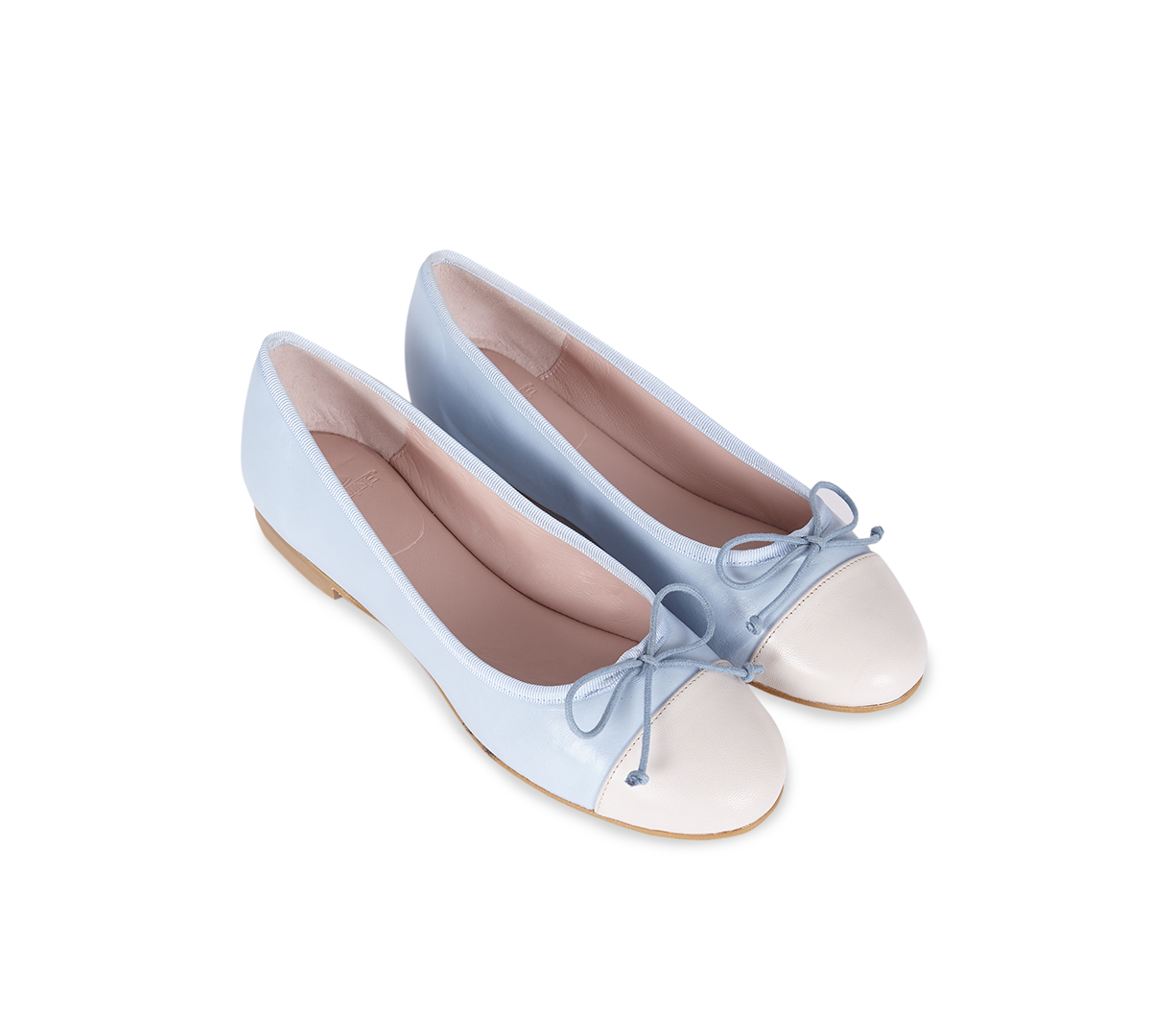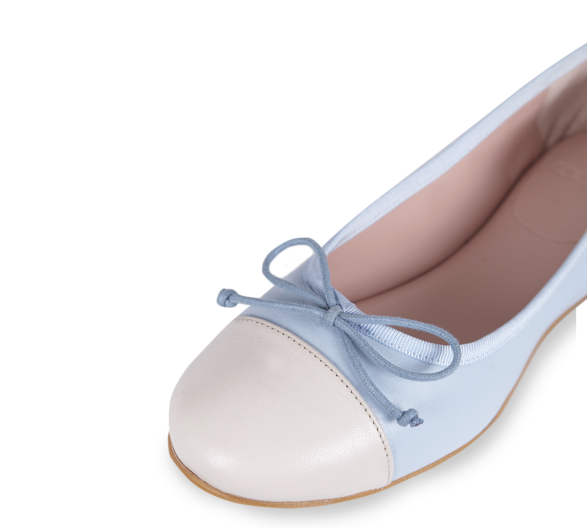 Bailarina “Horma Guante” color azul cielo puntera crudo lazo y ribete al tono azul