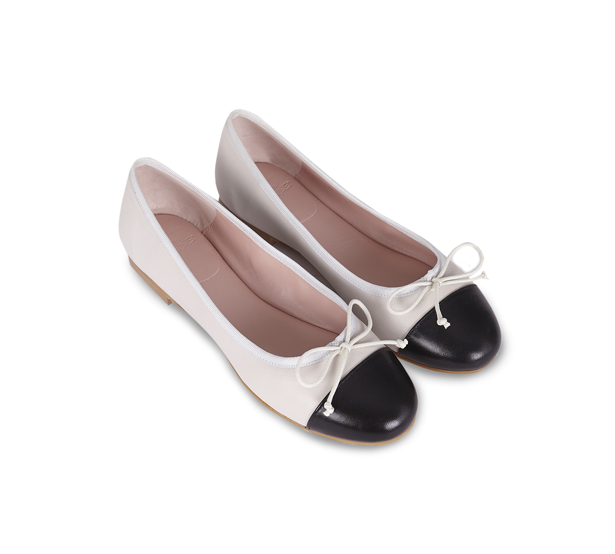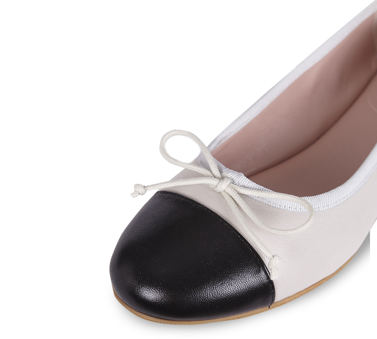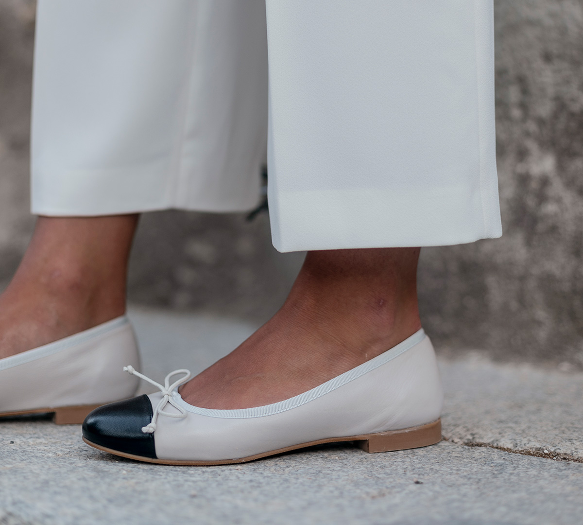Bailarina “Horma Guante” color crudo puntera negra lazo y ribete al tono crudo.
