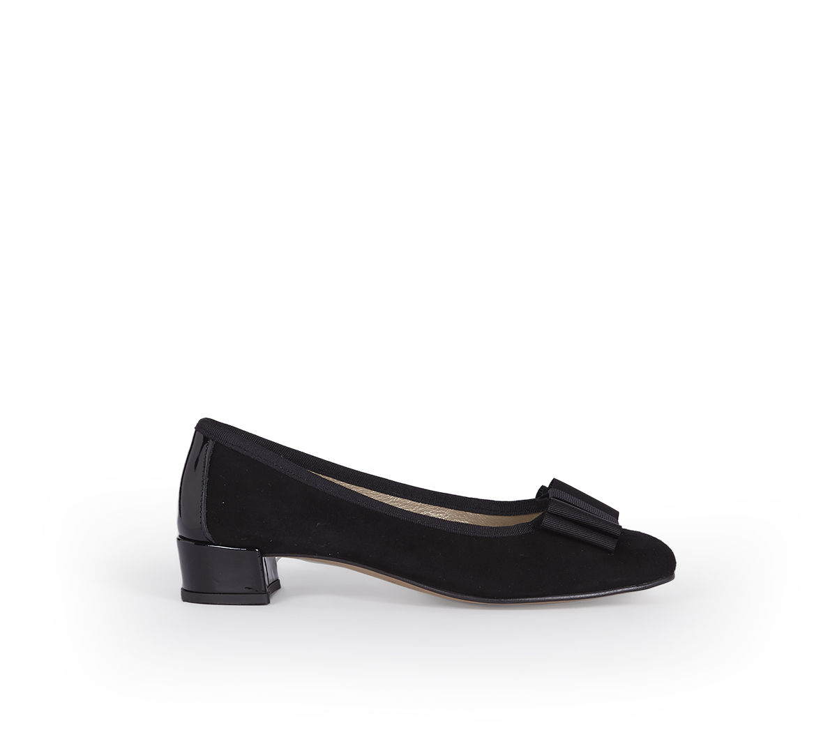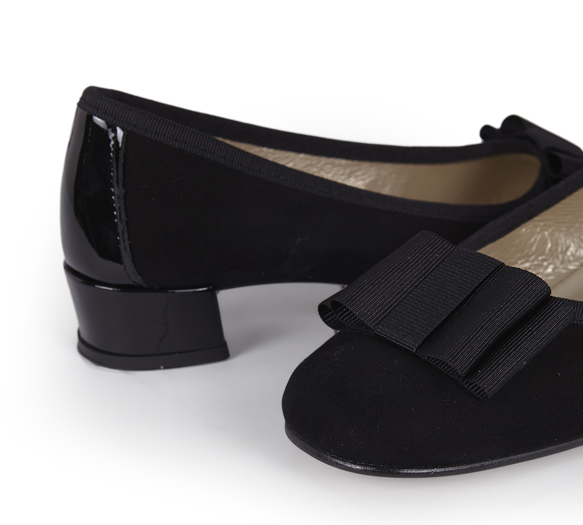 – Acabado con ribete de grosgrain al tono burdeos pespunteado y rematado con lazo zapatero de grosgrain al tono. Trasera en ante al tono y tacón de 5cm de charol al tono burdeos.