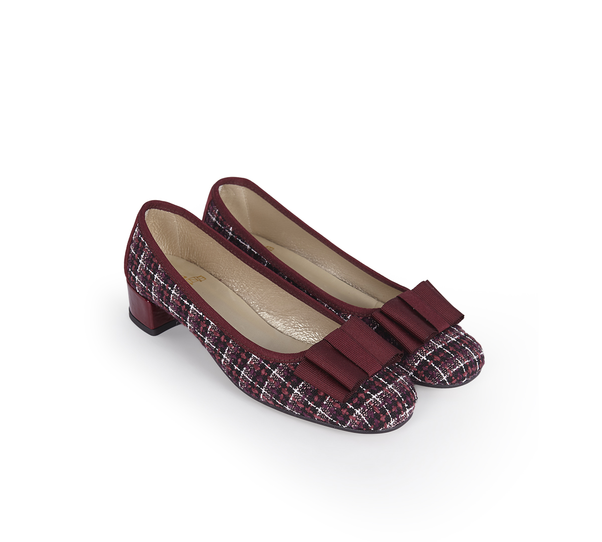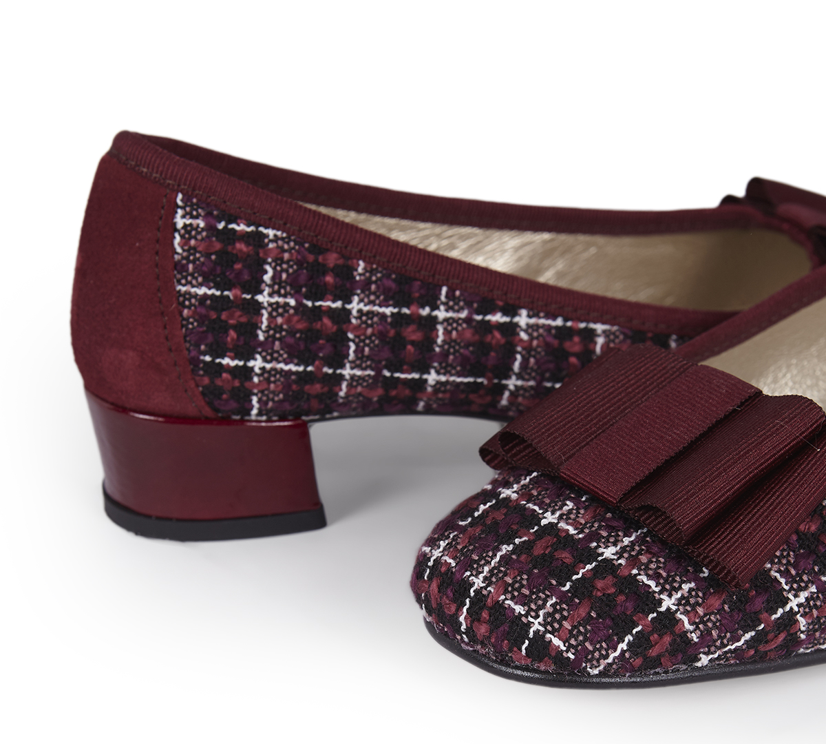 – Acabado con ribete de grosgrain al tono burdeos pespunteado y rematado con lazo zapatero de grosgrain al tono. Trasera en ante al tono y tacón de 5cm de charol al tono burdeos.